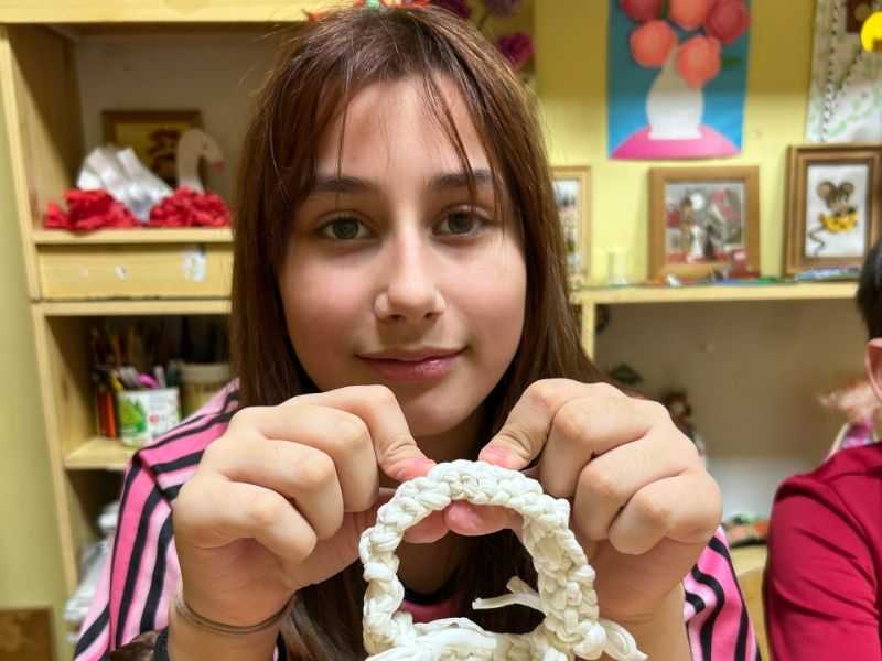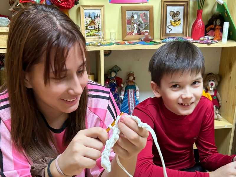 У ребят получается пока вязать браслетики, маленькие корзиночки и резиночки для волос, и это уже замечательно! Неспеша они осваивают технику, запоминают сам принцип работы с пряжей.