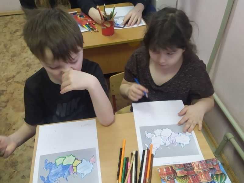 На контурных картах в цвете ребята обозначили территорию европейской части России, Урала, Сибири, Дальнего Востока, Поволжья.